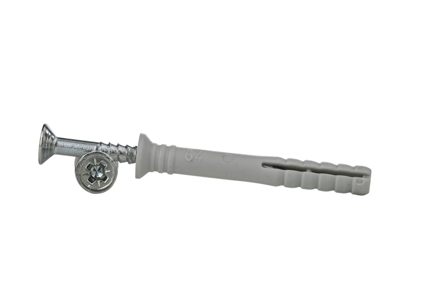 Die Schraube ist verzinkt und schützt vor Rost. Der Dübel besteht aus stabilem Kunststoff. Die Schraube ist aus Stahl. Das sorgt für eine lange Lebensdauer.